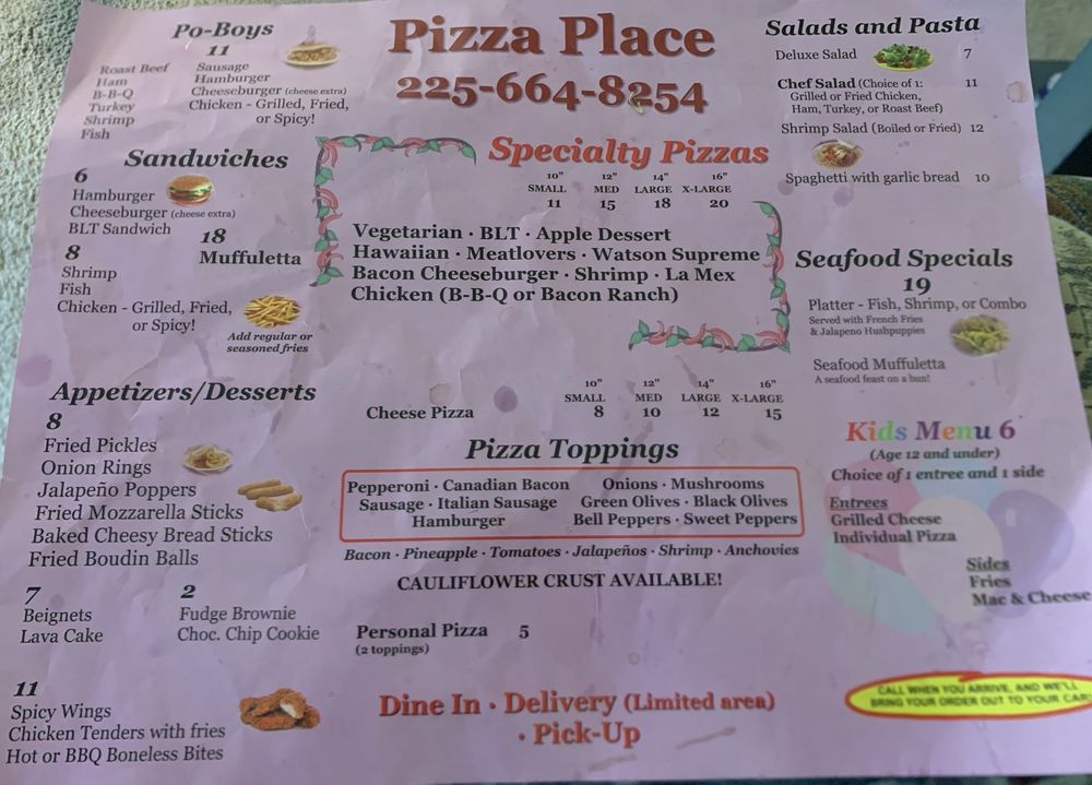 Customers rave about the friendly service and delicious food at Pizza Place. Reviewers have praised the quality of the pizzas, po-boys, and other menu items, highlighting the fresh ingredients and generous portions. Whether you're dining in, taking out, or having your meal delivered, Pizza Place is a must-try spot for pizza enthusiasts in the Denham Springs area.