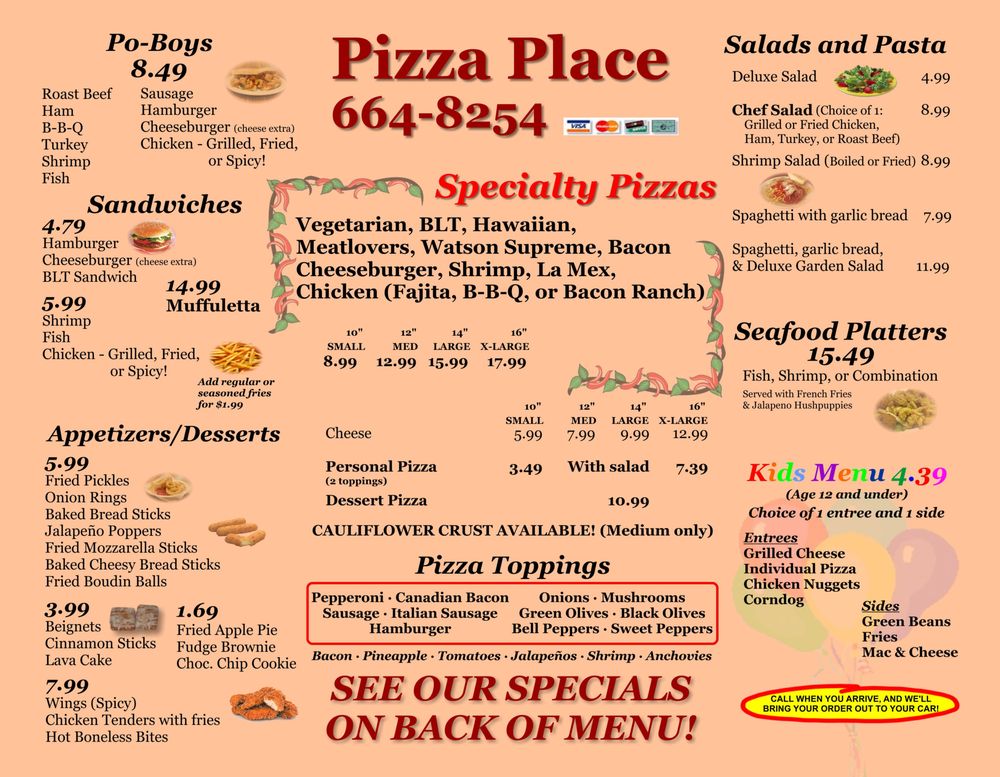 "Pizza Place" is a local gem in Denham Springs, LA that offers a variety of delicious pizzas, appetizers, and desserts. Their custom pizzas are a standout, with options like Cheese, Pepperoni, and a variety of toppings to choose from. The menu also includes tempting appetizers like Baked Bread Sticks and Wings, as well as mouth-watering desserts like Cinnamon Sticks and Chocolate Chip Cookies. Customers rave about the friendly service and the tasty food, with reviews highlighting favorites like the BBQ Po-boy and the Watson Supreme pizza. The cozy, family-owned atmosphere adds to the charm of this hidden gem. Whether you're craving a classic pepperoni pizza or want to try something more unique, Pizza Place is sure to satisfy your cravings.